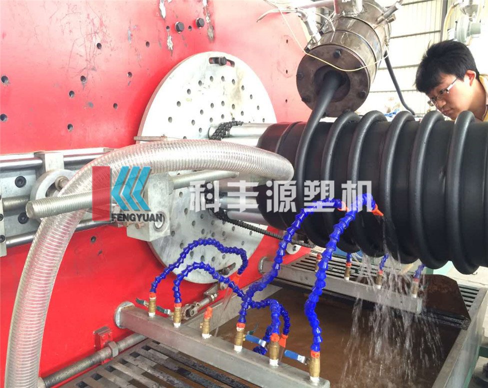 由于PE双壁波纹管多是大口径型规格,挤出成型用原料较多,所以一般厂家都采用双螺杆挤出机(平行或锥形双螺杆挤出机均可应用),PE双壁波纹管成型过程主要经过管材成型,管材切断和扩口等三个工艺流程,具体如下